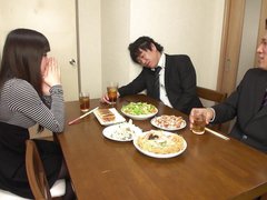 Japanese milf slut gives her cunt to her husband's coworker at dinner time!